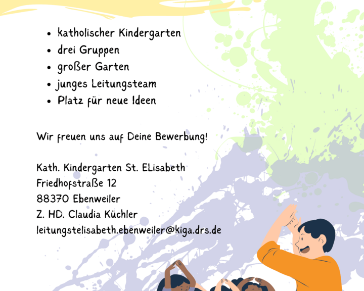 Im Kindergarten St. Elisabeth betreuen wir bis zu 62 Kinder im Alter von 1 bis 6 Jahren. Wir sind ein buntes und offenes Team und möchten die Kinder ein Stück auf ihrem Lebensweg begleiten und fördern. Eine vertrauensvolle Erziehungspartnerschaft mit den Eltern ist uns wichtig damit die Kinder wachsen und lernen können.